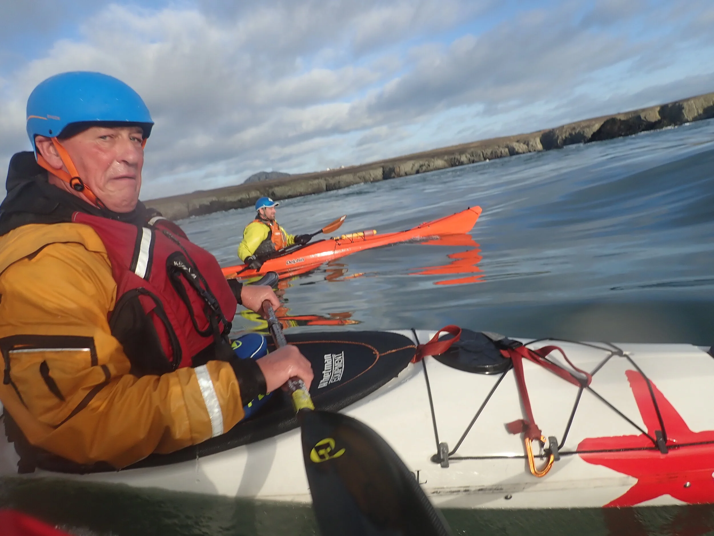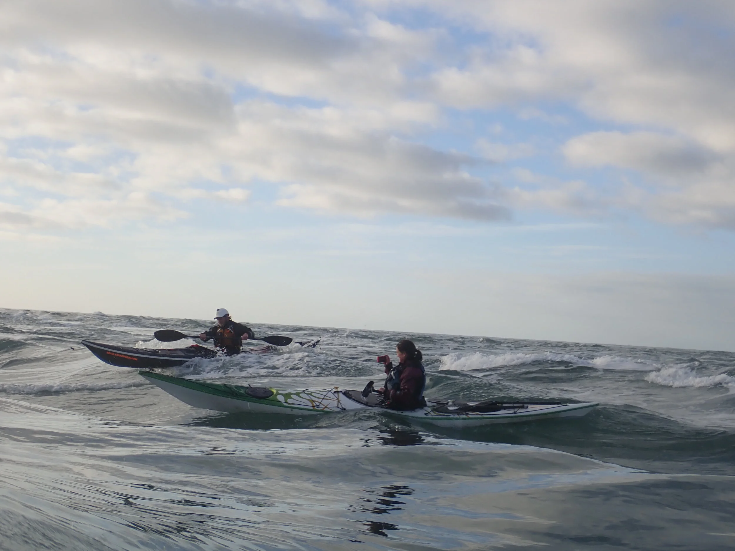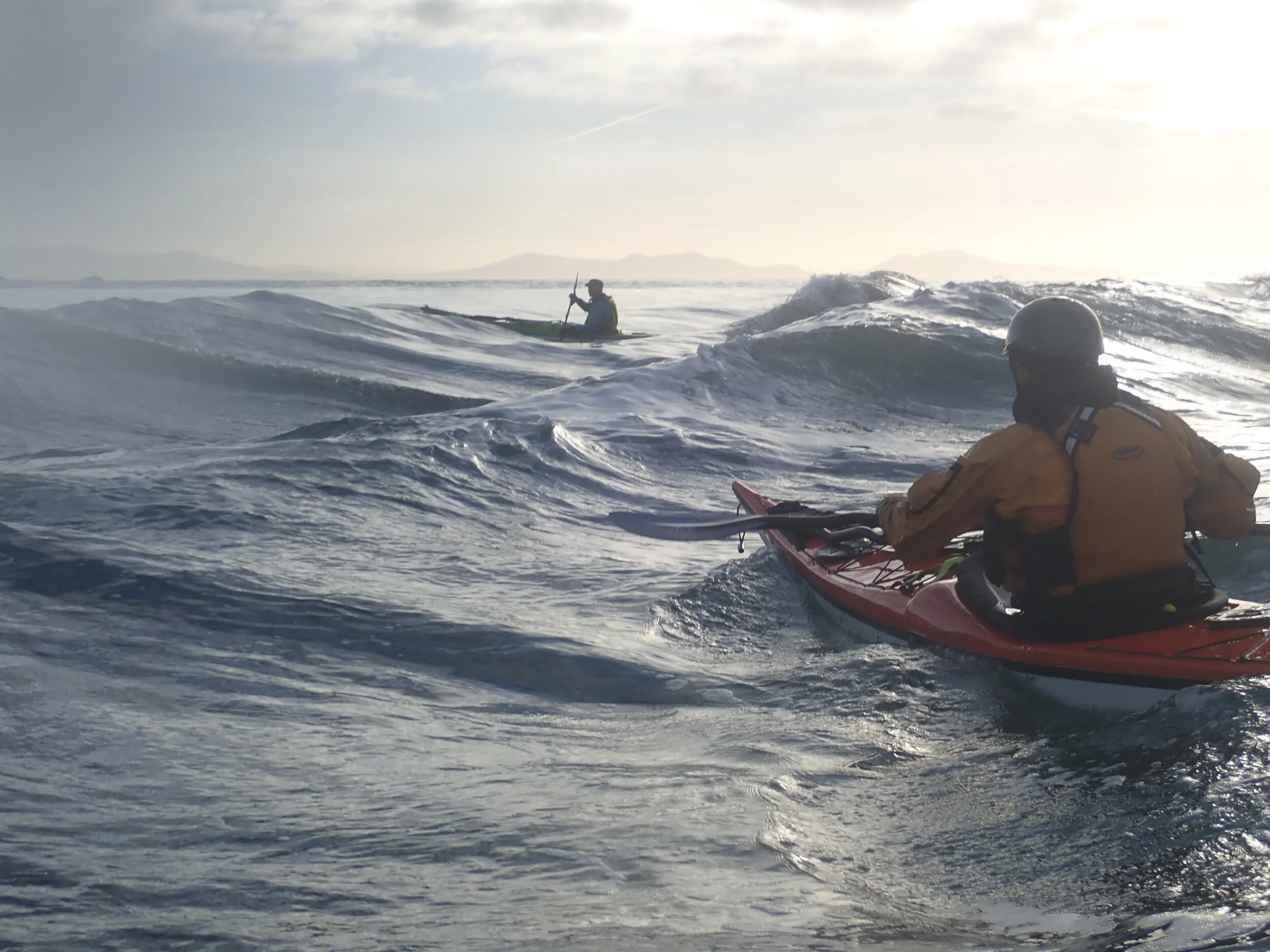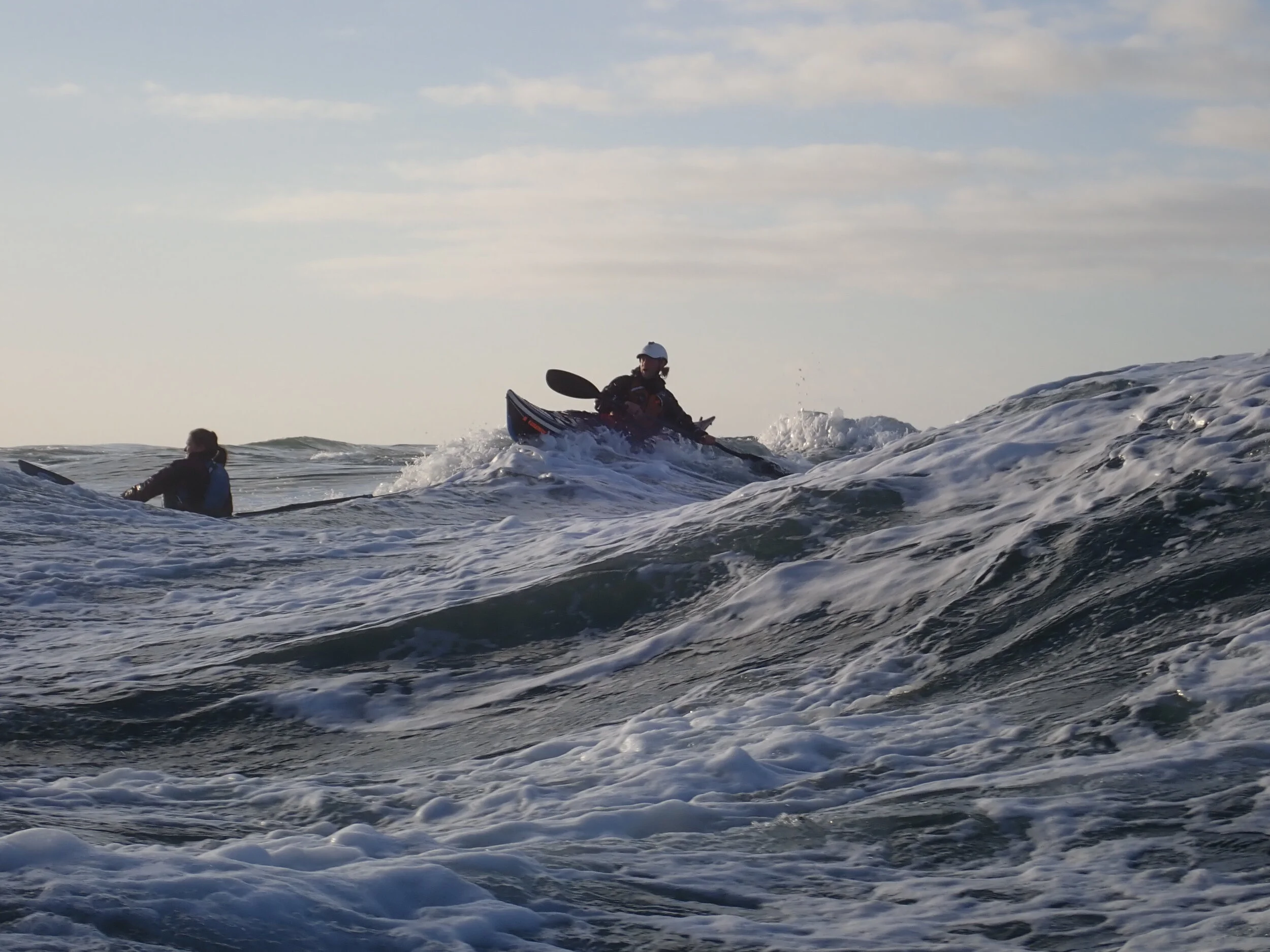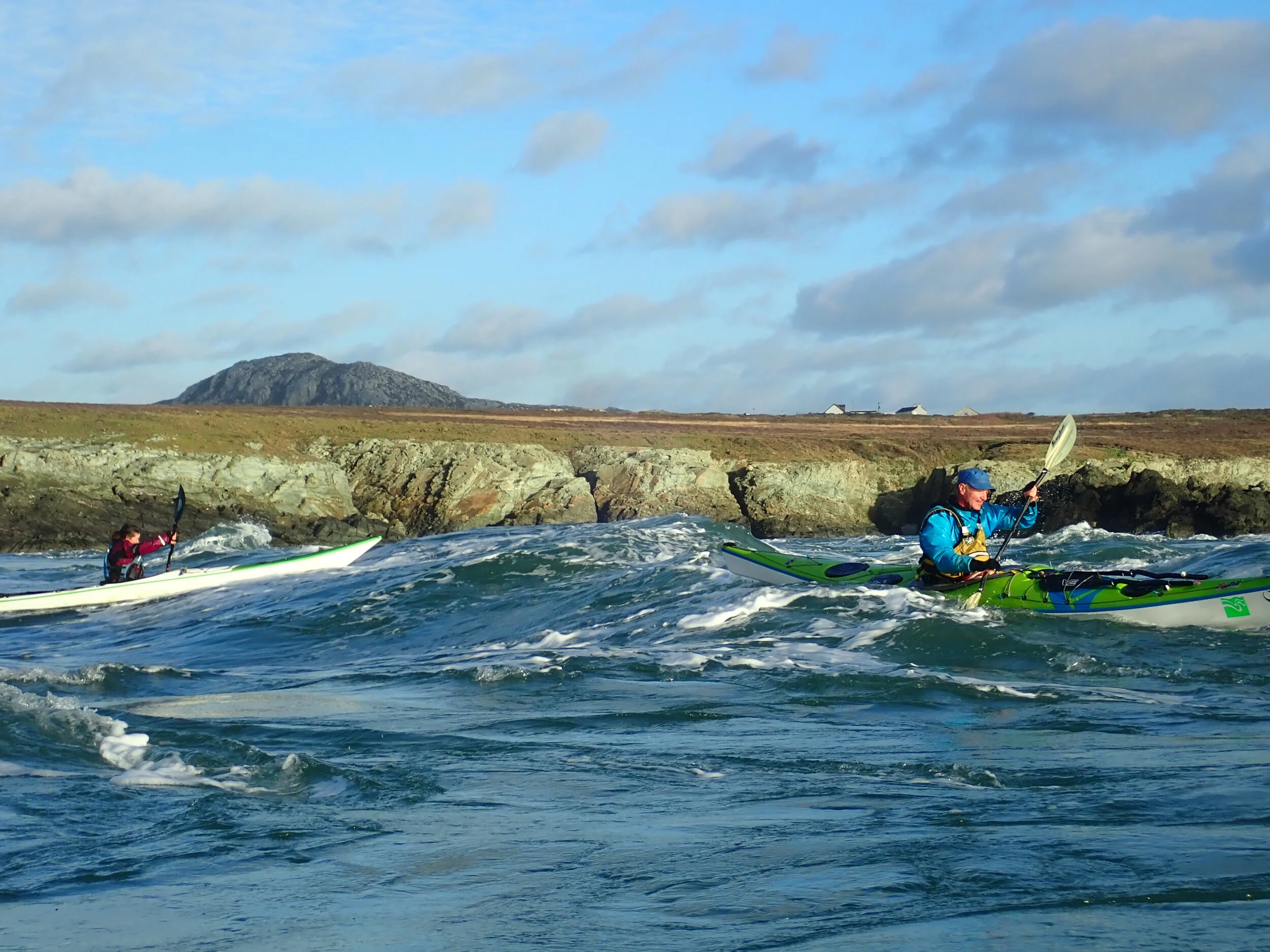 Round two at the races! Two recovery days from surfing South Stack and a great forecast of light Northerly winds with a Spring tide found our team of Roger, Justine, JF, Mirco, Jan, Garry, Geth, Steve, Barry, Paul and Me having a 'staggered' start from Porth Dafarch, heading North to the races of Penrhyn Mawr and South Stack. Now, The meaning of 'Porth Dafarch' may have originated from the contraction of 'Porth Dau Farch' (harbour/inlet of two horses/stallions). We didn't let accuracy get in the way of a good story (!) as the late arrivals (Paul, Steve and me) left Porth Dafarch behind as we paddled North towards Penrhyn Mawr and the first race. Thoughts of beautiful waves most definitely spurring us on; "Wild, wild horses, We'll ride them someday" (Rolling Stones)Tide pulling us through 'mini Mawr', we could soon see the rolling white of Penrhyn Mawr, along with the odd paddle flash from our friends already in the race. ..... And what a joyous race Penrhyn Mawr was today! Effectively, the last hour of a Spring tide, boils and whirlpools had subsided, water depth increased leaving beautiful rolling waves breaking, then running out onto an oily sea. Our efforts swiftly followed by lunch in the sun at Porth RuffydWith domestic commitments for several team members, our group now split. Paul, Gary, Steve, Jan and me headed North. Beautiful rock hopping towards South Stack and beyond. Looking West, South Stack race looked lively with a light breeze blowing spume from the crests of waves. So that's where we headed for a stunning surf session. Multiple and extended rides on rolling, near perfect waves. I truly didn't want to leave; "Wild Horses, Couldn't drag me away" .... But sadly, failing arms meant it was time to submit to the ebb flow and the paddle back to Porth Dafarch. Passing Penrhyn Mawr, now silent. Redolent and waiting for the flood, it was difficult to remember the excitement of the morning.Our day finished with a beautiful sunset as we packed soggy kit and warmed chilled bodies after another fabulous day.